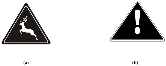 (a) “Attention deer crossing” icon. (b) “Pay attention to the car” icon from the rear side.