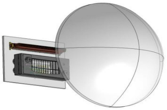 Chen designed a matrix car headlamp module with a matrix lens array, as shown in Figure 6, which can generate independent and non-overlapping rectangular light spots as needed [41]. There are a total of 45 luxeon chips developed by Lumides. Each LED chip corresponds to a rectangular lens. The output current of each LED is 500 MA, the voltage is 3.2 V, the light-emitting angle is 128°, and it can produce 150 lm luminous flux. It uses Lucidshape 2.0 software to realize optical simulation analysis. The secondary light modulation of the spherical lens achieves the required light distribution. The lenses of the rectangular lens array are not strictly symmetrical, which can avoid overlapping rectangular spots. The simulated horizontal beam angle is greater than 30°, the vertical beam angle is greater than 8°, the overall optical efficiency is 30.93%, and the luminous flux at 25 m is 1670 lm. Turning off some LEDs can realize the anti-glare function of the opposite driver.