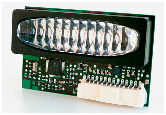 Osram developed of the first-generation LED matrix system “Smartrix” [39]. The light source is the Oslon Black Flat from Osram Opto Semiconductors with its low thermal resistance and high output even under extreme conditions, as shown in Figure 5. The biggest advantage of this module is the long-life silicone optics used as the collimation system of the LED system. The entire optical system is relatively small and compact, with good heat resistance and freedom, and its degree is high. The LED adjusts the input current on the voltage regulator through PWM, and each LED can be independently controlled. Compared with matrix light, it not only has an anti-glare function but also can be used for static low beam. There are 3 × 12 LED lights, which can adapt to the needs of different types of vehicles.