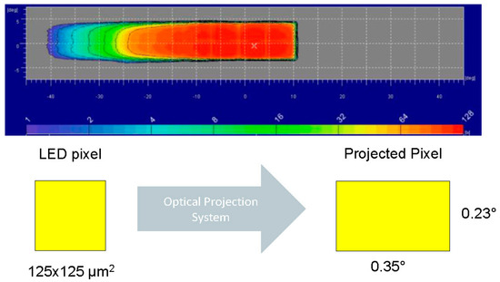 At present, there is a relatively mature solution, namely, Osram’s EVIYOS chip [42,43], which can realize a 0.25°/px system. Multiple pixel flip-chip LED chip arrays are directly mounted to the active driver, and 1021 pixels are addressed at a single speed through the serial data bus. The LED flip-chip is mounted on the silicon matrix driver chip with very small gaps and relatively uniform light distribution. In order to obtain a wider light distribution at 25 m, the optical system uses complex asymmetric projections for the secondary distribution of light and uses anamorphic lenses to correct color and distribution. As shown in Figure 7, the pixels between the LEDs are 125 μm, with a total of 32 × 32 pixels, and the total luminous flux can reach 3072 lm [44]. The control electronics of a single pixel are integrated on the chip to achieve precise control of each pixel with small size, low optical complexity, and high energy efficiency. The actual simulation efficiency of the headlamp prototype based on the EVIYOS chip exceeds 50%. The simulation effect is shown in the figure below. The horizontal angle of the left lamp is −40°, the vertical angle is 8°, and the optical system resolution of the light distribution center is horizontal. The horizontal direction is 0.35°, and the vertical direction is 0.23°.