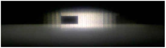 The CLS-class multi-beam headlamps of the Cedrus Mercedes-Benz have a total of 24 LEDs arranged in a grid pattern [53]. The LEDs have a light-emitting area of 0.5 mm2. Each LED can emit a light flux of 90 lm. The gap in the LED package is closed by the main optical device to homogenize the LED light and project it onto the road. The gap of each LED can make its light spots just coincide, and the external geometric structure converges to achieve a higher level of overall system efficiency. The LEDs pass through a total reflection optical device made of a fiber-like silicone material. The light emitted by the LED passes through the external geometry of the fiber and aligns with the auxiliary lens. This fusion achieves a high overall system efficiency, which can produce 90 lx illumination output in 25 m with a pixel width of 1.2°. The two modules produce more than 195 lx of lighting output and reach a high beam range of 485 m. The brightness gradient between full-power pixels and darkened pixels passes through the auxiliary lens surface, and the target microstructure is optimized, thus the overall adjustment has a significant mitigation effect. The light distribution is divided in vertical and horizontal directions, and it is more inclined than the 30° tilt observed in the conventional low beam module to use vertical or right-angle tilt. This tilt is produced by the grid distribution pattern. The anti-glare, as shown in Figure 8, is realized by turning off the light in the designated area, and the effect of adjusting the light in the area can be achieved. Matrix LED headlamps can save the head by illuminating only the body of the object with a lower lighting array, meaning that they can draw the driver’s attention to danger without dazzling people or animals in front of the vehicle.