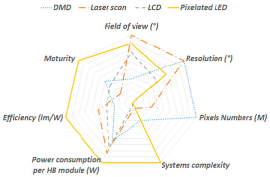 By comparing the existing mainstream pixelated architectures—LCD beam, DMD, laser scanning, and pixelated LEDs, as shown in Figure 9—Beddar argues that pixelated LEDs have higher efficiency and longer service lives and help to reduce CO2. The emission is in line with the current concept of green environmental protection [61].