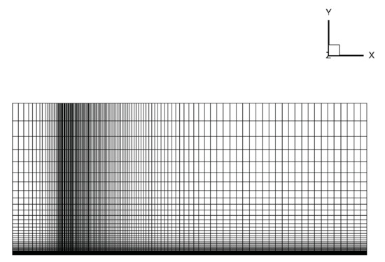 The test configuration had a 100 cm long × 15.1 cm wide × 10.1 cm high rectangular inlet duct followed by a backward-facing step of H = 1.27 cm. The geometry of the computational domain of the backward-facing step, shown in Figure 17, is defined as a function of the step height, H. The experiment took place at atmospheric total pressure and temperature. The freestream velocity was 44.2 m/s. The Reynolds number based on step height was = 36,000. The boundary conditions are also shown in Figure 17. A detail of the mesh near the step is shown in Figure 18.