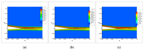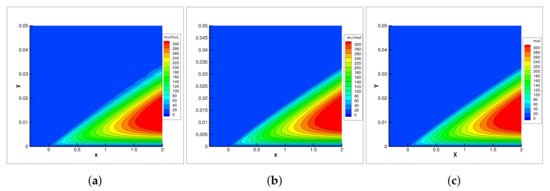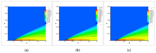 Contours of for flat plate using Spalart–Allmaras turbulence model: (a) UNS3D-SEQ, (b) UNS3D-PAR, and (c) FUN3D [20].