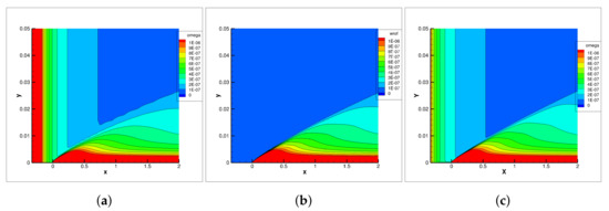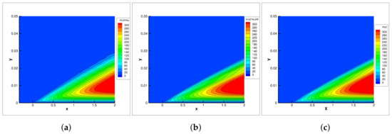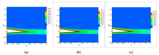 Figure 3 shows a comparison of the dimensionless turbulent viscosity predicted by the UNS3D-SEQ, UNS3D-PAR, and FUN3D codes using the Spalart–Allmaras turbulence model. A good agreement was obtained among the solutions of the three codes. A similar conclusion emerged by comparing the dimensionless turbulent viscosity predicted using the Shear Stress Transport turbulence model, shown in Figure 4. The large values of the turbulent viscosity extended farther away from the flat plate in the Spalart–Allmaras model compared to the Shear Stress Transport model, as observed by contrasting Figure 3 and Figure 4.