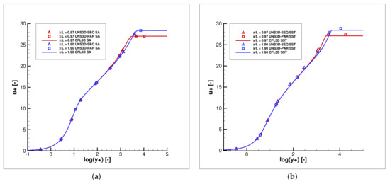 Figure 7 shows the variation of dimensionless velocity , where is the friction velocity, as a function of . A good agreement is observed among the results generated by UNS3D-SEQ, UNS3D-PAR, and CFL3D codes, for both the Spalart–Allmaras and Shear Stress Transport models.