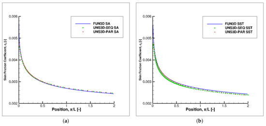 Figure 8 shows the skin friction coefficients predicted using the Spalart–Allmaras and Shear Stress Transport models. For the Spalart–Allmaras model, the skin friction coefficient was calculated using UNS3D-SEQ, UNS3D-PAR, and FUN3D codes. The agreement among the results generated by these three codes was excellent. For the Shear Stress Transport model, the skin friction coefficient was calculated using UNS3D-SEQ, UNS3D-PAR, and FUN3D codes. The skin friction coefficient predicted by the UNS3D-SEQ code was slightly smaller than the results predicted by the other two codes. Most likely, this difference is due to the fact that UNS3D-SEQ used a coarser grid than the other two codes, as shown in Table 3.