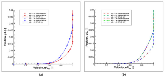 Velocity profiles on Nakayama’s airfoil: (a) Spalart–Allmaras, and (b) Shear Stress Transport.