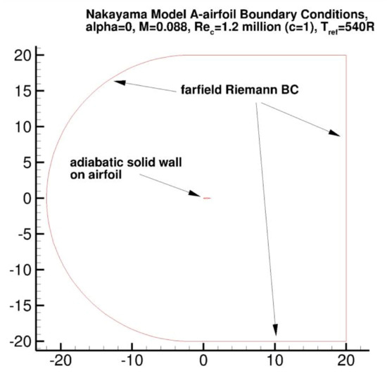 The Spalart–Allmaras turbulence model utilizes both the Dirichlet and Neumann boundary conditions for its working variable . Dirichlet boundary conditions are applied to the inlet/freestream and wall boundaries, while Neumann boundary conditions are applied for symmetry boundaries. Table 2 lists the boundary conditions for the Spalart–Allmaras turbulence model.
