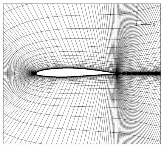 Figure 22 shows the computational mesh for two adjacent airfoils. The flow, however, was calculated over a single passage by using periodic boundary conditions to simulate the rest of the cascade. A multiblock O4H-grid padded with inlet and outlet H-grids was used to discretize the computational domain. The number of grid nodes varied between 39 k on the coarse mesh to 182 k on the fine mesh. Figure 22 shows the coarse grid. In the plane, the fine mesh used 401 × 101 nodes on the O-grid, 62 × 49 nodes on the block prior to the leading edge, 82 × 29 nodes on the block downstream from the trailing edge, 305 × 25 above and below the airfoil, 160 × 97 at inlet, and 200 × 77 at outlet. One cell was used the spanwise direction, as the flow was modeled as two-dimensional and the flow solver was three-dimensional.