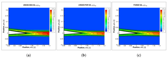 As with the turbulent flat plate case, the freestream values of and for UNS3D-PAR SST were different from the values used for the FUN3D simulation. Figure 12 shows the contour plots of the dimensionless turbulent viscosity at the airfoil’s trailing edge predicted using the Spalart–Allmaras model. There is good agreement between the results generated by the UNS3D-PAR and FUN3D codes. The turbulent viscosity predicted by the UNS3D-SEQ code, which used the coarse grid, was similar to the two codes; however, the lack of grid refinement at the trailing edge leads to a somewhat thicker wake.