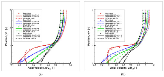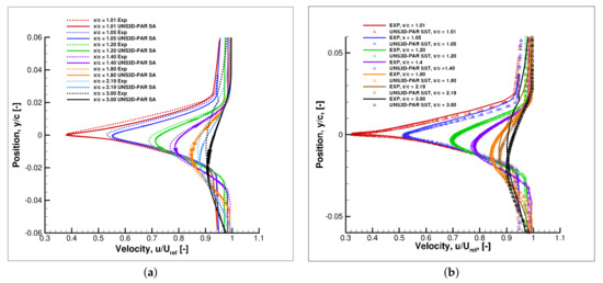Velocity profiles on backward-facing step: (a) Spalart–Allmaras, and (b) Shear Stress Transport.