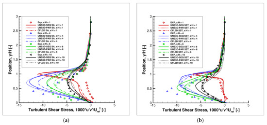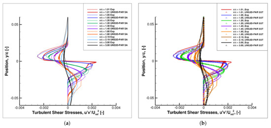 Dimensionless turbulent shear stress profiles on Nakayama’s airfoil: (a) Spalart–Allmaras, and (b) Shear Stress Transport.