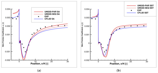 Coefficient of friction on backward-facing step: (a) Spalart–Allmaras, and (b) Shear Stress Transport.