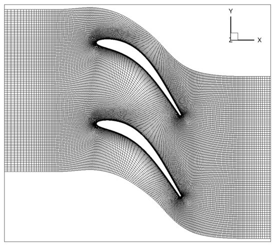 The airfoil chord is 77.8 mm, the pitch is 56.55 mm, and the stagger angle is −40.85. The inflow angle is 15.2. The input flow conditions are listed in Table 6.