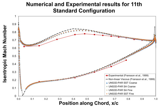 Figure 23 shows a comparison of the measured and predicted Mach number over the airfoil. The UNS3D-PAR code was used with the Spalart–Allmaras and Shear Stress Transport turbulence models. The results generated by the coarse and fine meshes were almost identical. Furthermore, the results generated by the two turbulence models were almost identical. On the pressure side, the UNS3D-PAR code results matched the experimental data well. Over the last one-quarter of chord, the predicted flow, however, had a higher velocity than the measured one. On the suction side, the predicted flow had a higher velocity than the measured one over 60% of the airfoil. The UNS3D-PAR code results matched the experimental data better than the numerical results reported in [24].