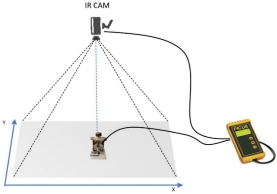 Schematic of the measurement system. The electronic board (for the acquiring, controlling, and calculating of the signals) is connected by wires to the infrared (IR) camera and to the hitting device (probe).
