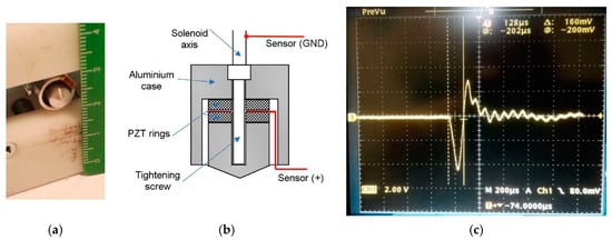The developed impact force sensor: (a) a photo of the sensor; (b) a mechanical draw of the sensor, using two PZT rings; (c) a scope photo of the signal due to an impact on a “non damaged” surface.