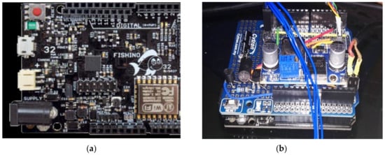 The 32-bit microcontroller unit: (a) the Fishino32 board; (b) the shield board used in the paper.