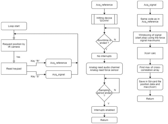 The implemented software is depicted in Figure 6. The audio sampling frequency was set to 200 kHz, and considering that the analyzed signals are in the band up to 10 kHz, the signal is oversampled, in order to avoid aliasing problems. The force-sensor sampling frequency was set to 500 kHz to acquire a sufficient number of points to measure properly the impact-time. The depth of quantization is 10 bit. As already stated in the introduction, the concept underlying the algorithm is to establish a test point at which there is certainty: this point can, for example, be adherent with certainty. The restorer, based on his experience and professionalism, establishes the test point; with respect to this point all the other points will be compared, and the result will tell if the point under examination is similar to the one taken as test-point or is definitely dissimilar from it, using both the information coming from the impact-time measurement and the correlation index that is calculated by comparing the audio recorded by the test point and the point being measured.