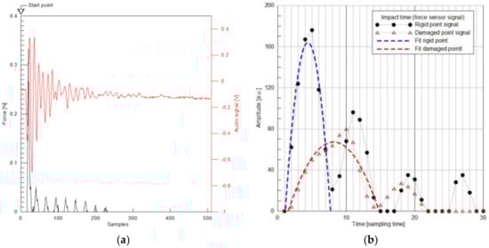 An example of the acquired audio signal and the relative force sensor signal. In (a) is showed the window of the samples that will be calculated by the cross-correlation algorithm. In (b) the comparison between the contact-time of a rigid area (blue fit) vs. a damaged area (red fit).