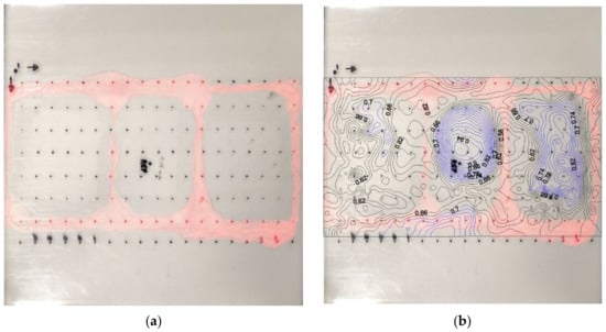 The test object 1 made in the laboratory. It is a 4.8 mm thick PMMA slab, glued using cyanoacrylate as shown in (a) on a 20 × 20 cm tile used as a base. The measurement carried out was reported in (b) using the contour lines technique.