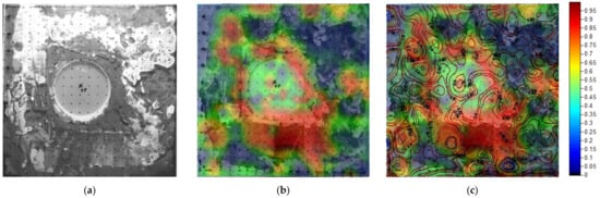Figure 9 shows the measurement carried out on Test Object 2, using both the impact-test data (Figure 9b) and the audio cross-correlation index (Figure 9c), to demonstrate the fusion of data. This object was made using a 20 × 20 cm sheet of transparent PMMA with a thickness of 4.8 mm, glued to a base consisting of a tile of the same size covered with quick-setting cement mortar. To obtain a certainly empty chamber, a circular (7.5 cm in diameter) 4.8 mm thick was used in the central part. The evident non-uniformity in the thickness of the cement mortar revealed few points of actual contact with the PMMA slab. Furthermore, the bonding of the plate to the mortar was only partial, and in fact this circumstance was measured and displayed in Figure 9b. The center point of the test object was chosen as the test point for the audio cross-correlation, certainly non-attached, and used as a reference for the entire measurement of the object. The data were then processed using the contour map technique (after kriging gridding) in Surfer. In this case, unlike the previous one in Figure 8, the recognition of the zones is less evident, also because the measured mesh is much more complex. Figure 9c shows high-level contour lines in the vicinity of the point chosen as the test point (as it was obvious to expect), while the areas evidently more adherent are those represented by level curves of lower value and colored blue to highlight them. In Figure 9b, the same test-object was measured using the impact-test method: the information by this measurement is in a good agreement with the effective structure of the test-object depicted in Figure 9a and with the audio measure of Figure 9c. Fusion of the data for this test object made it possible to highlight with certainty the points of effective intimate contact with the PMMA plate: in fact the only different color assumed by the cement mortar could be misleading in relation to the areas actually adhered.