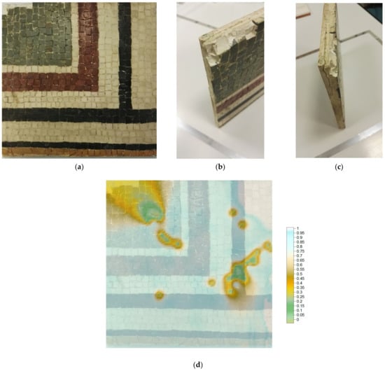 In (a) Roman floor mosaic (ca. 20 × 20 cm). In (b,c) there is a clear detachment from the adhesion surface. In (d) the analysis carried out with the device described in this paper, obtained with about 200 measurement points and superimposed on the photo of the handwork for a better understanding of the position of the defects.