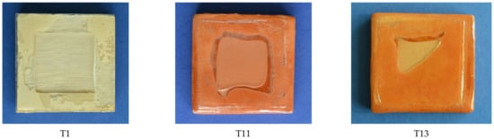The tile models T1–T11–T13 with artificial cavities, different in shape and depth, were manufactured assembling thin technical glasses of the type SCHOTT D 263® LA eco [] (a colorless borosilicate glass, having thickness 0.7 mm, density 2.51 g/cm3, and Young’s modulus 72.9 GPa) on small clay substrates using epoxy glue. The physical properties of these technical glasses and of the epoxy glue allowed simulating the physical properties (air cavity thickness, glaze thickness, density and elastic properties) of the real tiles in vibro-acoustic phenomena. The manufacturing process was carried out at room temperature using epoxy glue with medium drying time (30 min) to prevent cracks during the drying process.