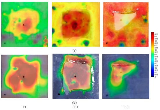 PICUS measurements on the tile models with artificial delamination T1, T11 and T13, using the two data processing methods: the audio data processing at the top (a), the impact-time processing at the bottom (b). The reference point is marked with a black point at the center of the cavities.