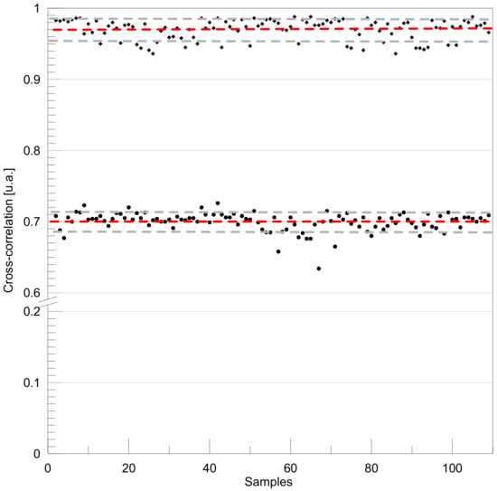 In this paragraph we want to give an estimate of some typical parameters such as the repeatability of the measurement in question and its reliability. Avoiding going into the specifics of the discussions, we refer to the references for any further details [,]. For the moment we can say, starting from the concept that the measure in question is a relative measure (it is a cross-correlation coefficient, that is a test of similarity between two signals) that it has been repeated on the same points hundreds of times. Figure 13 shows one of the measurements made, as follows: two points have been chosen, one as a reference in a well-attached point, the second is a sure not-well-attached point; the test was performed by repeating one hundred independent measurements, alternating the measurement in the two points, manually moving between the two points (thus simulating the actual measurement performed by the restorer, with an accuracy of ± 5 mm), and trying to always measure the two established points, with the help of the XY coordinates displayed by the device.