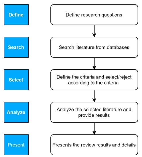 The grounded theory approach has been used for this systematic literature review. The authors followed the theory proposed by [57]. This theory helps researchers to review step by step and explore more depth and breadth on the topic. The acquired approach consisted of five main phases (define, search, select, analyze, and present) illustrated in Figure 1.