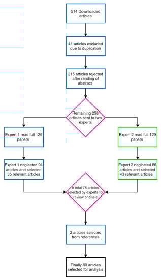 Keywords and queries were mapped onto the downloaded articles from reliable search engines and databases listed in Table 3. Full texts and downloaded abstracts were thoroughly explored, and 514 articles were selected in the first phase.