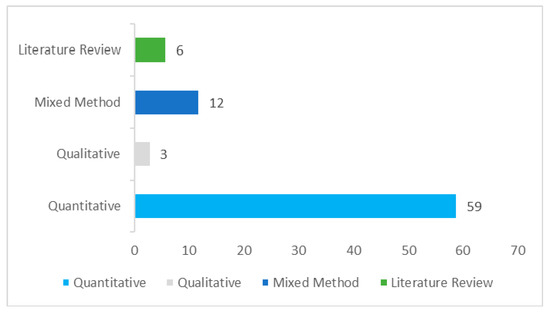 After applying the selection criteria to 514 downloaded articles, 41 articles were excluded due to duplication, 215 articles were rejected after reading the abstract, and two experts reviewed the remaining 258 papers. One hundred and eighty papers were rejected after a full read of articles by two experts with reasons. Finally, two papers were added from references. Hence, 80 studies (qualitative, quantitative, and literature review) in total were selected for this review. Figure 2 presents the studies’ inclusion and exclusion process Figure 3 exhibits the year wise study inclusion, whereas Figure 4 depicts the methodologies adopted in each study.