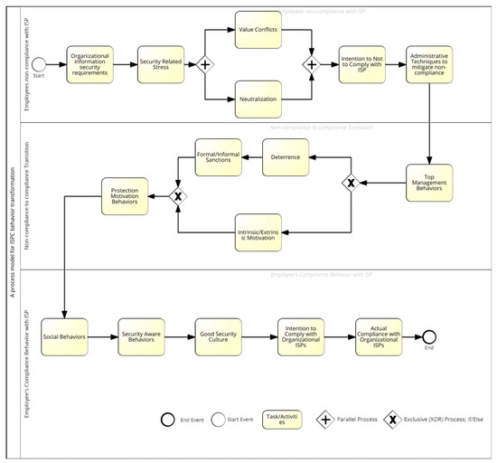 In order to develop a process model, process management is deemed as the next crucial step. Typically, process management is explained as an effective way to present all the objective and subjective business goals in graphical format [29]. A process is a pictorial illustration of a specific goal, while Business Process Management is the art of skillfully presenting the said goal [30,31]. There are many modeling languages available for process modeling, such as Business Process Modeling Notation (BPMN), Event-Driven Process Chains (EPC), Yet Another Workflow Language (YAWL), and Petri nets. In this paper, the authors follow the standard language BPMN. The process for behavior transformation has been drawn using SIGNAVIO, an online tool available for process development. The developed process model can help information security managers to understand the behaviors related to security policy compliance/noncompliance. Thus, this paper focused on information security behavioral studies to evaluate all the concepts used in the last decade for information security behavior (ISB) towards ISP compliance/noncompliance. The current review will also help researchers find the transformation activities and noncompliance behavior events to compliance behavior.