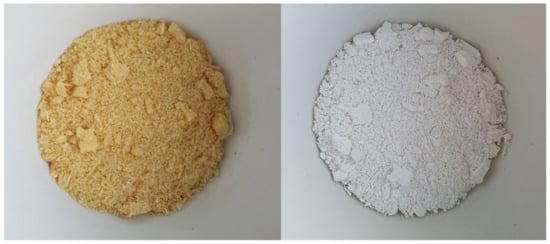 Crushed fish bones before and after thermal treatment.