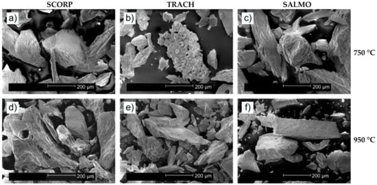 SEM micrographs of (a) Scorpaena scrofa, (b) Trachurus trachurus, and (c) Salmo salar bones calcined at 750 °C, as well as (d) Scorpaena scrofa, (e) Trachurus trachurus, and (f) Salmo salar bones calcined at 950 °C.