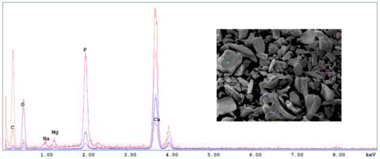 The first approximation of the chemical composition of the different powders was obtained from energy dispersive spectroscopy performed during the scanning microscopy. As can be seen in Figure 4, corresponding to Scorpaena scrofa treated at 950 °C, the main components of the powders were phosphorus, calcium, magnesium, and sodium.
