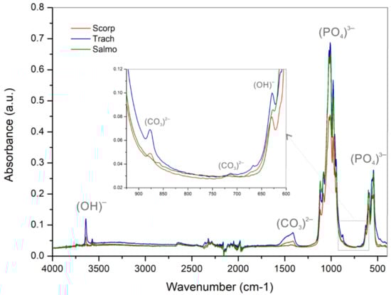 FTIR analyses were performed on all samples calcined at 950 °C to identify the functional groups. Figure 5 shows the FTIR spectra from all the samples analysed, exhibiting narrow bands that suggest a high crystallinity degree. The presence of phosphate groups (PO4)−3 can be identified for the three species. These groups show bands at ~960 cm−1 and between 1000 and 1200 cm−1 due to the stretching modes of P-O bonds, as well as bands between 540 and 600 cm−1 corresponding to the bending mode of the phosphate groups. Hydroxyl groups (OH)− can be observed in two different regions, with low intensity bands between 3500 and 3600 cm−1, corresponding to its stretching mode, and at ~630 cm−1, corresponding to its bending mode. Carbonate groups (CO3)−2 are also present with bands around 714 cm−1, 875 cm−1, and between 1400 and 1460 cm−1 [33]. In particular, peaks between 1400 and 1460 cm−1 are associated with the bending mode in B-type hydroxyapatite, due to the substitution of (PO4)−3 by the (CO3)−2 group [15,34,35], in accordance to the high Ca/P ratio obtained from ICP-OES analysis. Peaks located in these bands, associated with the carbonate groups, present a very low intensity, especially for the Salmo sample, which can probably be due to the carbonate decomposition into carbon dioxide that takes place at temperatures between 750 and 1100 °C [36].