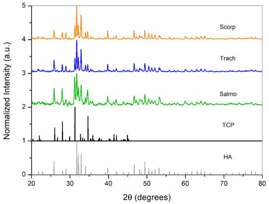 The crystallite size of the samples calcined at 750 °C, measured from the (211) reflection, was around 50 nm (except for Salmo), which is very similar to the average crystallite size in mature bone [41]. However, the increase in calcination temperature to 950 °C lead to an increase in crystallinity and the growth of the crystallites to values around 60 nm.