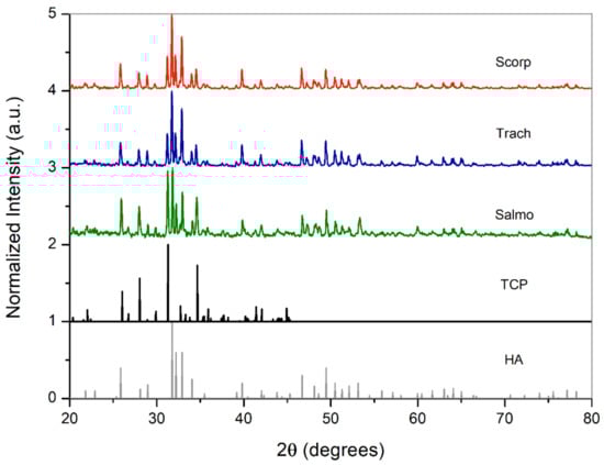 These procedures are excellent from a laboratory point of view, but they are far from the capabilities of the factory ships processing fish or the aquaculture facilities for human consumption. Therefore, the objective of this work is to study the transformation of fish discards (not only bones) into calcium phosphates. Fish discards were used as received from the aquaculture facilities and the fishing ships without any extraordinary cleaning process. Discards from scorpionfish (Scorpaena scrofa) and Atlantic horse mackerel (Trachurus trachurus), as well as from by-products generated from aquaculture and canning processes (heads and trimmings frames) of Atlantic salmon (Salmon salar) were used to obtain calcium phosphate.