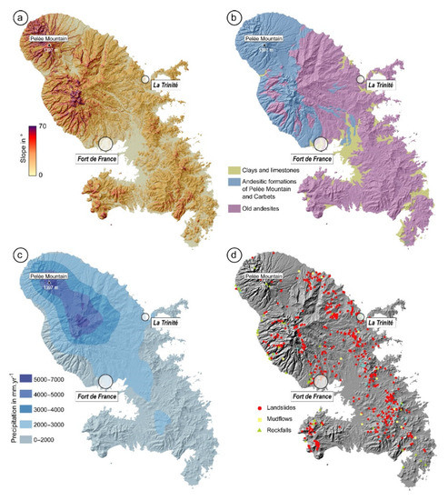 Location of La Martinique (the names of main cities are given in italics); (a) slope map; (b) simplified geological map; (c) precipitation map (mean annual rainfall per year); (d) landslides: type and locations (from French national landslide database: BD-MVT, https://www.georisques.gouv.fr/ accessed on the 18 May 2020).