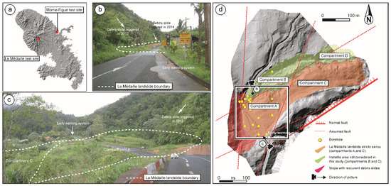 La Médaille landslide; (a) location of test site; (b) picture of the early warning system to block road traffic in case of landslide activity; (c) panorama of compartment A of the landslide; (d) structural scheme of the landslide (map is produced with the hillshade from Helimap DTM, 2013).