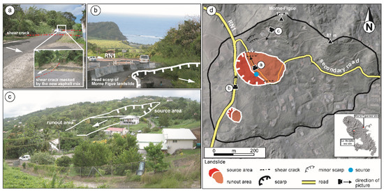 Morne-Figue area; (a) picture of the limit north of the Morne-Figue landslide (the bumps on the road are produced by the shear cracks of the landslide); (b) main scarp of the Morne-Figue landslide in 1989; (c) panorama of the Morne-Figue area; (d) main morphological landslide features (the map was produced with an orthophoto from IGN, 2015, and hillshade map from Litto3D DTM, IGN, 2010).