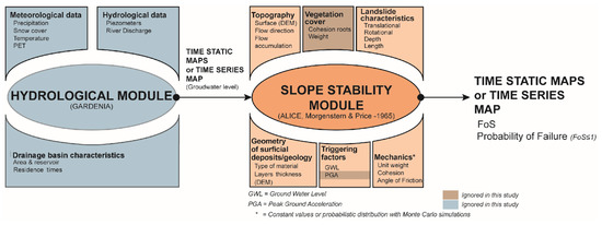 Landside modeling is performed with ALICE® (Assessment of Landslide Induced by Climatic Events) developed by the French Geological Survey (BRGM, [69]). This tool supports landslide susceptibility mapping for areas ranging from local sites (catchments) to large areas (several municipalities; [15,69,70,71]). Developed in a GIS environment (MAPINFO®), it is a SPBM described in [69] and summarized below (Figure 5).