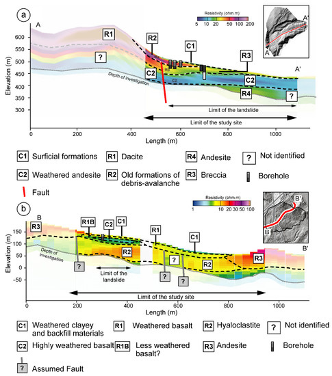 Figure 6c,d show two resistivity grids at two different depths, between 2 and 4 m and between 19 and 24 m. The resistivity range is globally low (<50 Ω.m). At the surface, the highest resistivity corresponds to andesites and volcanic-sedimentary formations. Weathered basalts have a lower resistivity (< 8 Ω.m). Landslides occur in the majority of these materials described in [62,63]. In between, it is possible to define the hyaloclastites. Resistivity profiles are displayed in Figure 7b and Figure S2. Nearby boreholes are also shown. Six horizons are delineated: a conductive layer (C1; <5 Ω.m) corresponding to a very weathered clayey layer and backfill materials that is more or less saturated following the groundwater level, and a more resistive layer (R1; from 5 Ω.m to 8 Ω.m) corresponding to less weathered clay materials. Locally, this layer disappears in lieu of a more conductive layer C2 (from 2 Ω m to 5 Ω m).