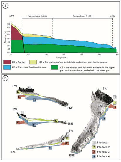 For the La Médaille landslide, four layers were defined (Figure 8a): (i) a first layer corresponding to dacitic screes (R2) upstream of the landslide on steep slopes and on compartment A of the landslide. The thickness varies from a few decimeters to approximately 5 m upstream of compartment A. On compartment A of the landslide, the thickness varies from 5 m to 20 m. (ii) A second layer corresponds to andesite screes (R3) with a thickness between 40 m under compartment A and a few meters downstream of compartment C. Therefore, R2 rests on R3 along compartment A and forms compartment C alone. (iii) A third layer corresponds to dacite (R1) located under R2 up to the concave slope failure corresponding to the upstream limit of the landslide. It is limited downstream by the north-south fault. Its thickness varies from 20 to 90 m. (iv) A fourth layer corresponds to andesite (C2) forming the bedrock. The fault observed in the resistivity profile (Figure 7a) and documented in the geological map [26,27] is not integrated in the geotechnical model. Figure 8a shows the failure hypothesis described in [54] and questioned in [57]. The new information on formations and their thicknesses introduced in the geotechnical model and numerical simulations under ALICE® should help to better understand how destabilization occurs.