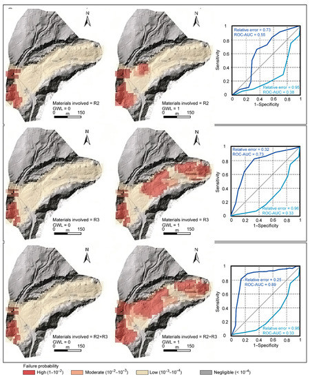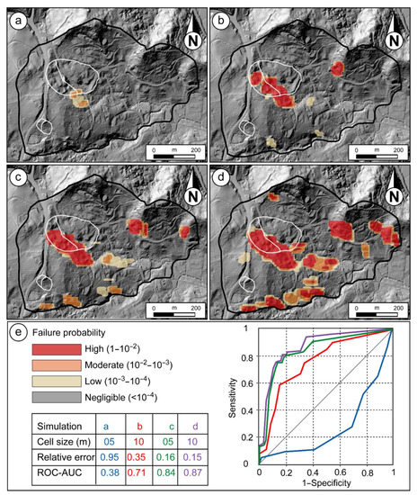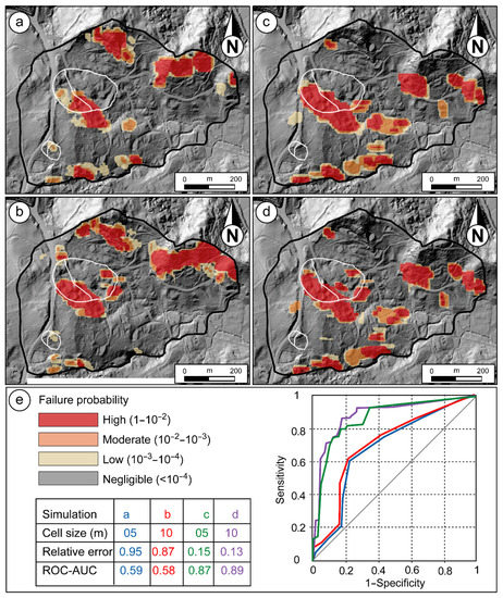 For each step, the failure geometries were fixed following the field observations (Table 2). The validation of simulations is performed by comparison with (i) an expert map derived from field observations and DTM derivatives for the La Médaille landslide [62,76] and (ii) the landslide inventory performed in 2016 for the Morne-Figue area [62]. Different classical statistical tests are computed (relative error and ROC-AUC; [69,70,71]) to validate the results. These tests were completed by expert (qualitative) verification.