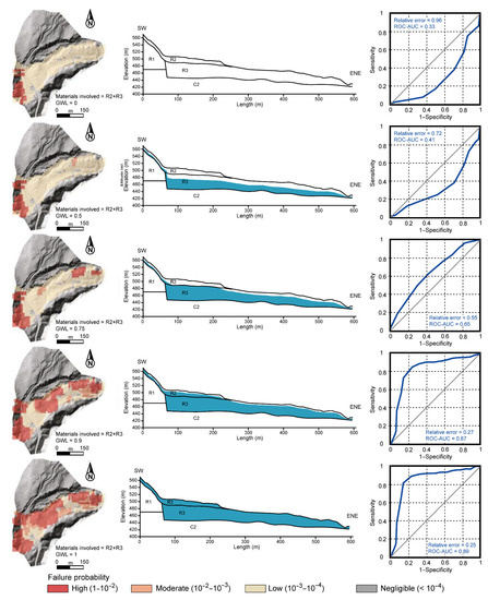 The geometry of the studied area is introduced in raster format with (i) the topography and (ii) the geometry of different material layers. Geomechanical characteristics, cohesion (c), friction angle (φ) and specific bulk unit weight (γ), are given for each lithology and surficial formation. These parameters can be implemented by a constant value or by probabilistic distributions to take into account environmental variability and uncertainties [69,70]. The tool supports different landslide geometries and failures (i.e., rotational, translational, and complex with different lengths and depths). Two triggering factors can be used: (i) the groundwater level (GWL) or (ii) seismic acceleration. The GWL represents the saturation ratio (m = h/z), where h is the height of the water table and z is the depth of the material(s) taken into account. The GWL can be implemented empirically in one or several formations by increasing the saturation level from 0 (dry conditions) to 1 (saturated conditions) or with the help of a hydrogeological model taking into account the effective rainfalls. Seismic acceleration is represented by the peak ground acceleration (PGA).