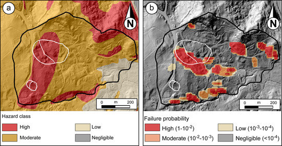 where Wi: weight; αi: base inclination; ui: average water pressure; bi: width of the slice; φi: effective friction angle; c’i: cohesion along the base; and Ri: sum of the shear resistances, except the normal shear interslice forces. Ti is the component tending to cause instability. The potential failure is expressed by the factor of safety (FoS). If the FoS is below 1, the slope (i.e., the computation cell) is considered instable. The slope stability assessment is performed on regularly spaced 2D profiles automatically produced over the whole area and based on maximum gradient lines from the DTM. Two types of computation are possible, (i) the computation of the FoS or (ii) the computation of the probability, to obtain an FoS below 1 for each cell. In the second case, the tool performs a random selection of each geotechnical value following probabilistic distributions and Monte Carlo simulations [69,70,71].